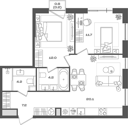 Комплекс предлагает широкий выбор квартир — от уютных студий до просторных многокомнатных апартаментов, что позволяет каждому найти идеальное жилье под свои нужды