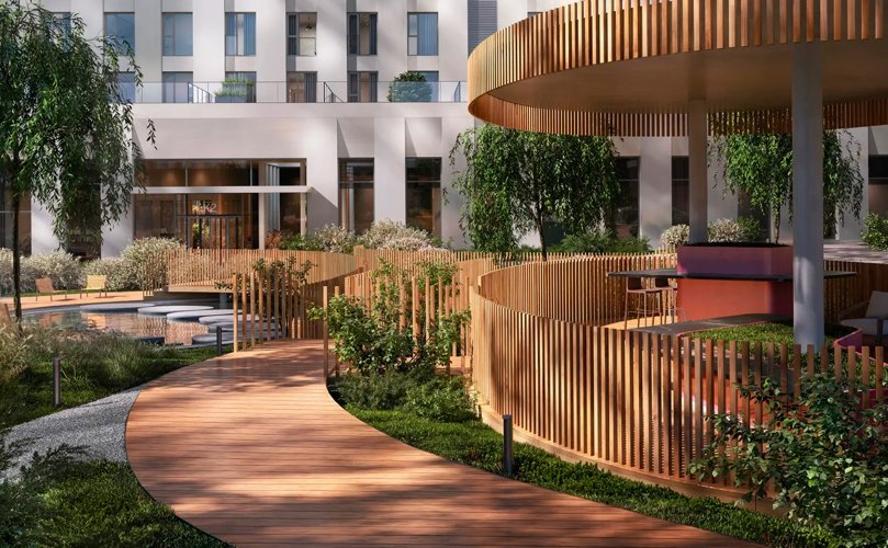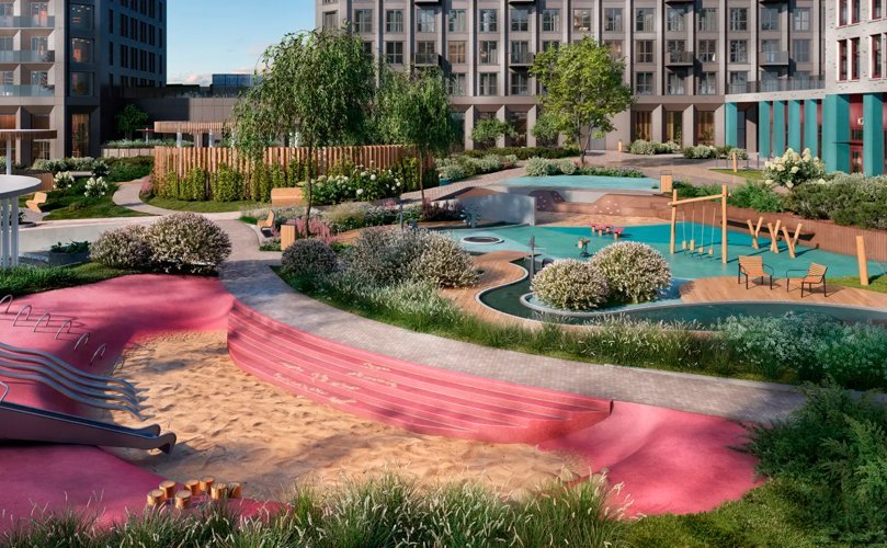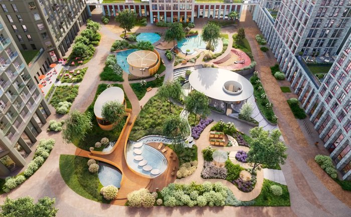 Проект окружен благоустроенными парками и скверами, создающими атмосферу спокойствия и уюта для отдыха на свежем воздухе