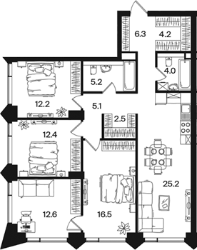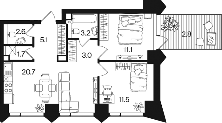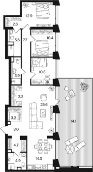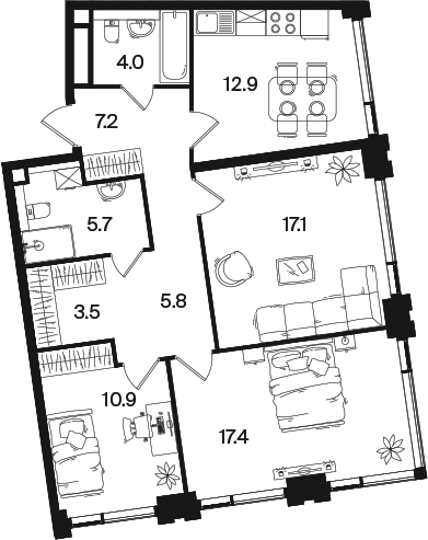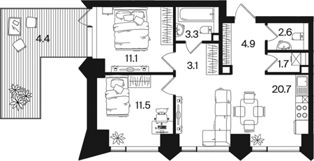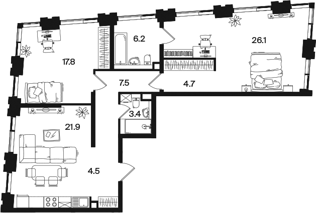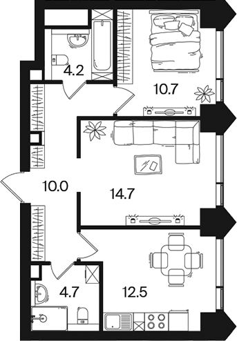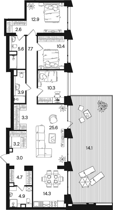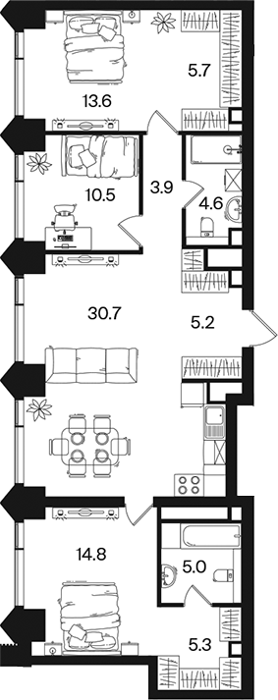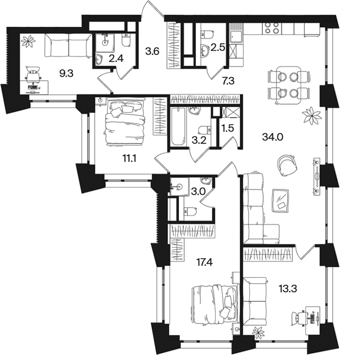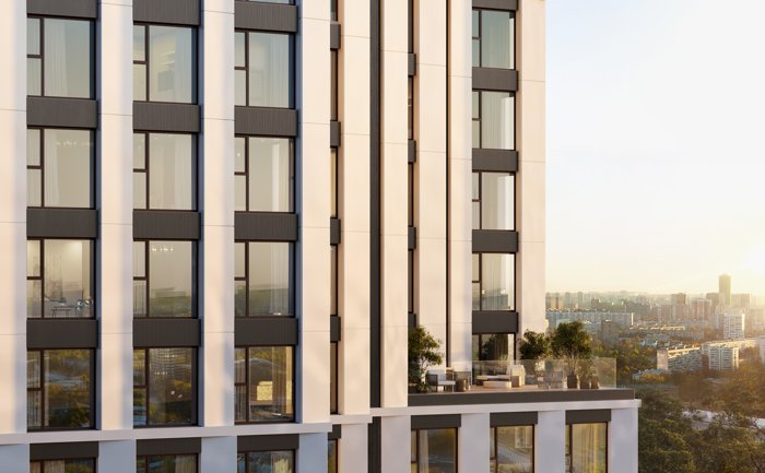 В проекте представлены квартиры от студий до просторных многокомнатных лотов с террасами, мастер-спальнями и увеличенной высотой потолков, что позволяет выбрать жилье под любые потребности