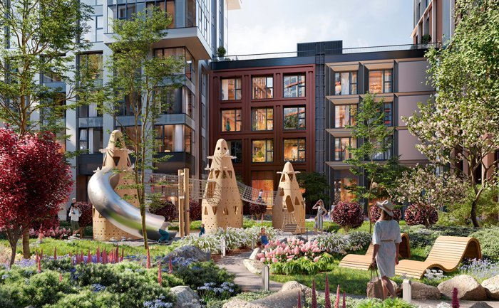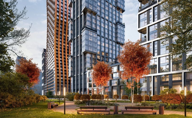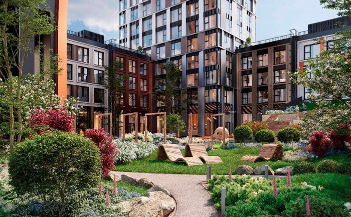 Проект интегрирован в природную среду с густым озеленением, каскадом парков и видами на Сходненский канал, что создает ощущение уединения и спокойствия