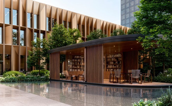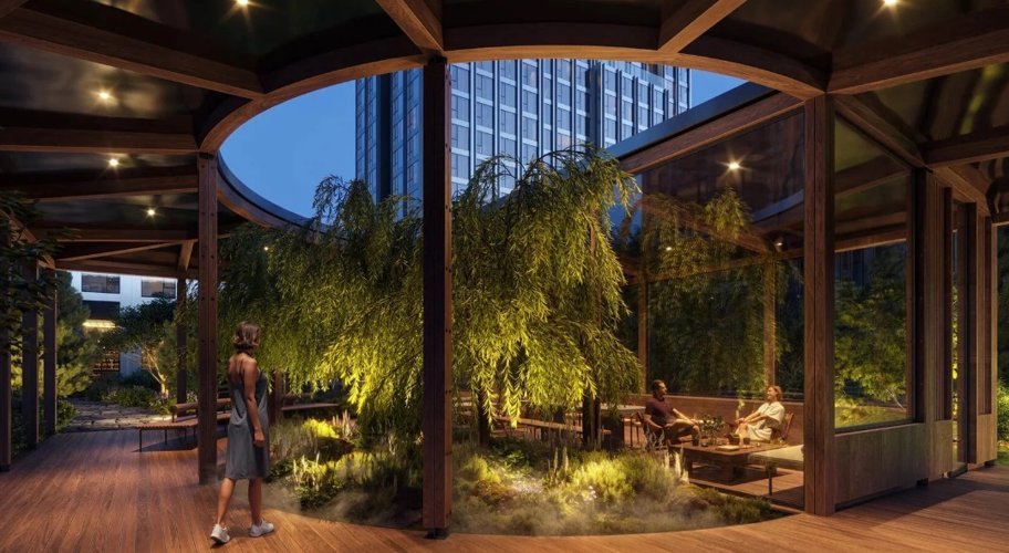 Внутреннее пространство включает зоны "Кленовая роща", "Волшебный лес", центральную площадь с прудом и амфитеатром, а также чайный павильон для отдыха
