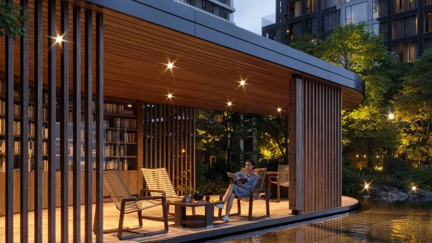 Использование натуральных материалов в отделке общественных зон (дерево, мрамор), а также звукоизоляция и индивидуальное кондиционирование в квартирах
