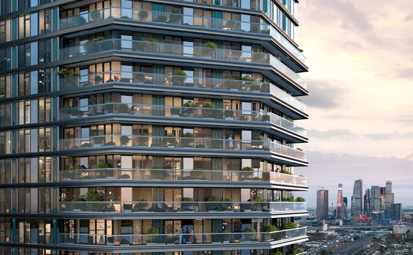 Основным элементом архитектуры выступают рельефные окна и объемные террасы, облик новостройки особенно «оживает» по вечерам благодаря художественной подсветке, меняющей оттенок в зависимости от погодных условий.